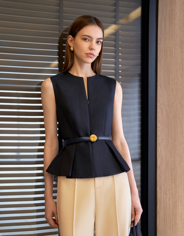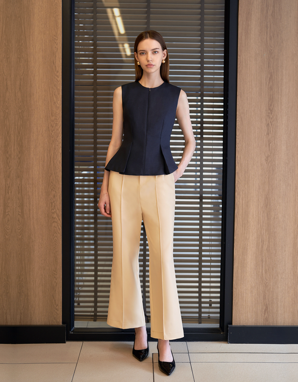 The mid-rise fit offers just the right amount of comfort and support, avoiding the pinch of high-rise and the fuss of low-rise. Subtle front seams draw the eye downward, creating a long, lean line, while practical side pockets keep your day-to-day stylishly functional. Finished with a slight flare at the hem, these trousers blend timeless tailoring with a fashion-forward twist—perfect for powering through the workday or owning the evening with ease.- Loose fit