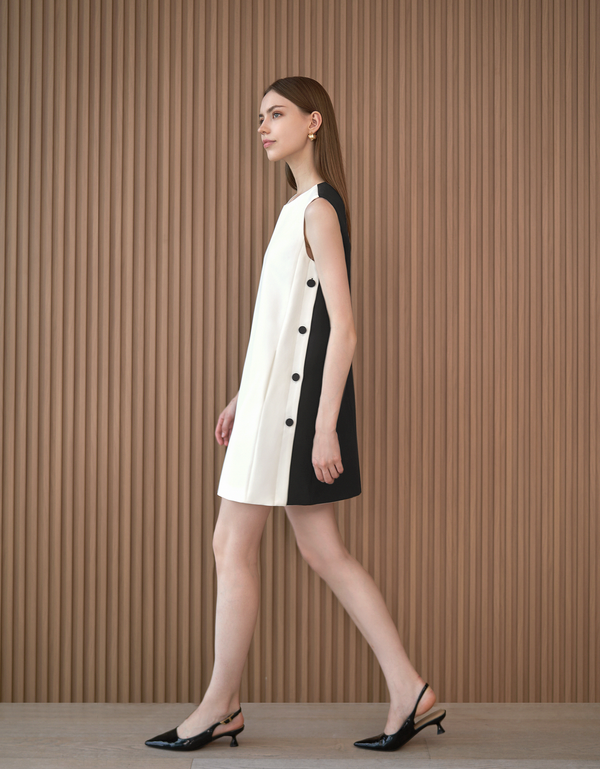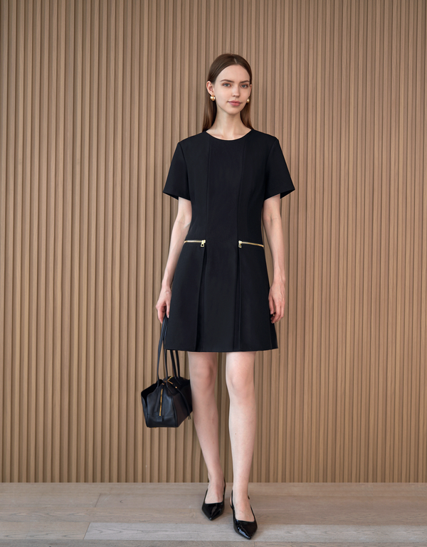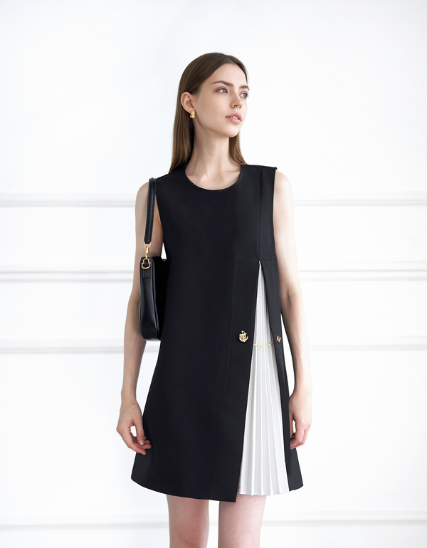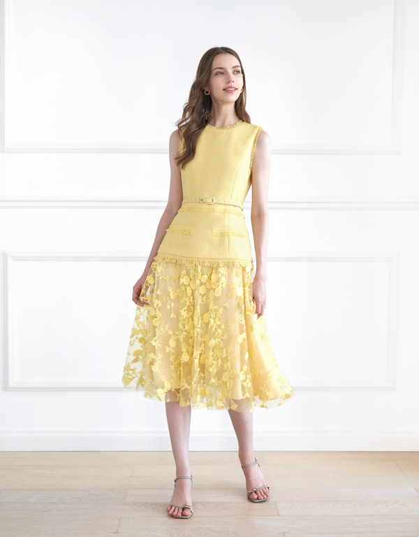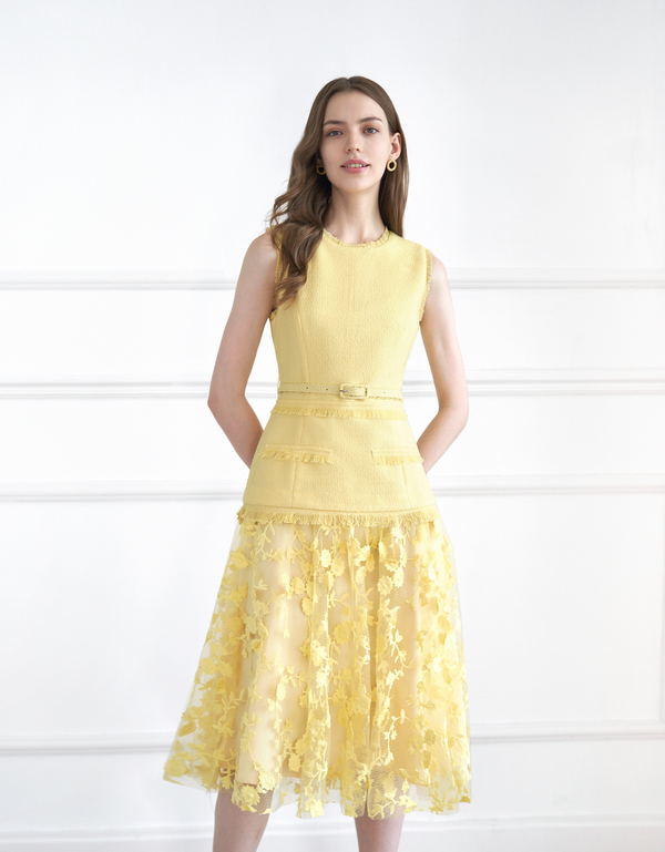 Tweed Bodice Semi Sheer Pleated Bottom Dress