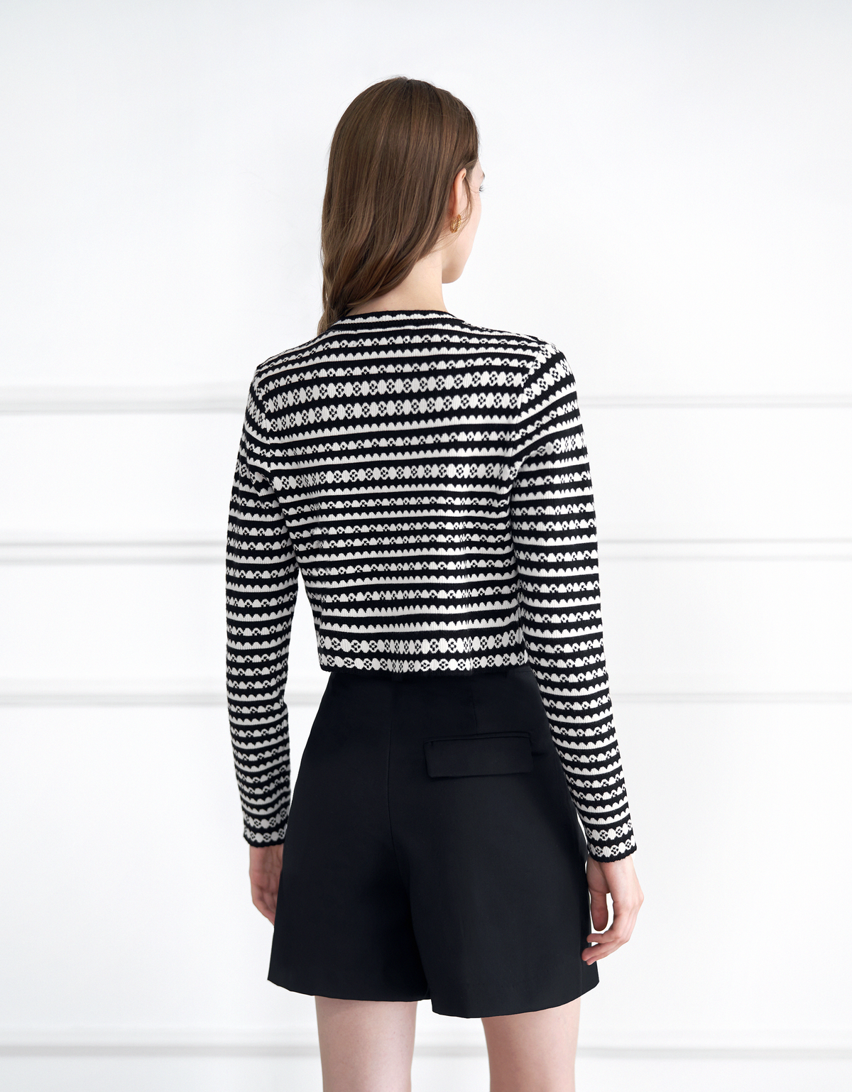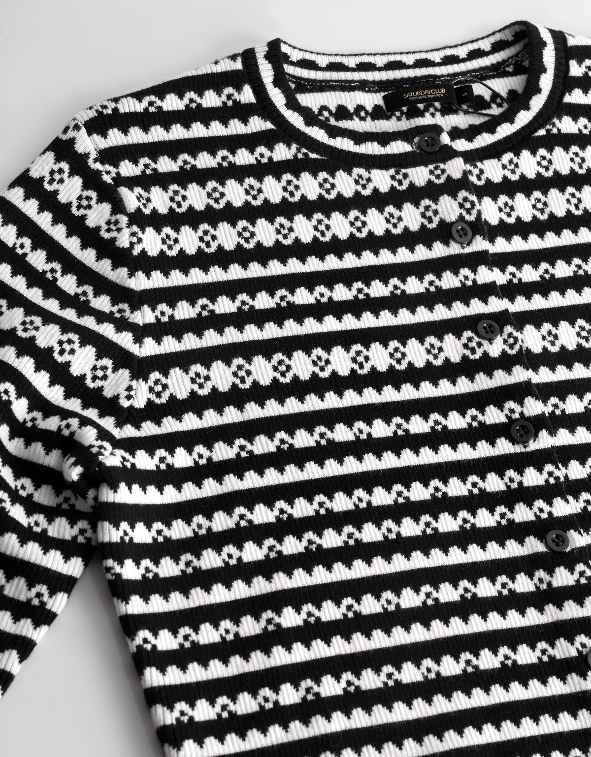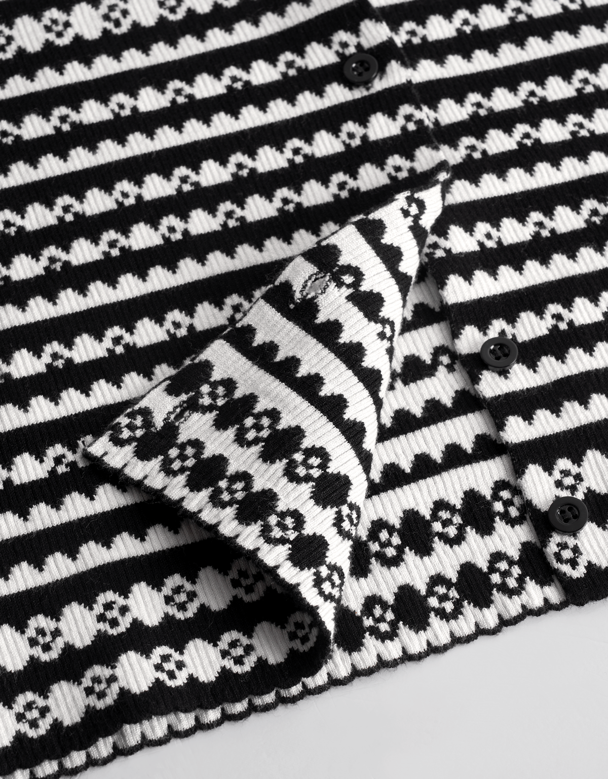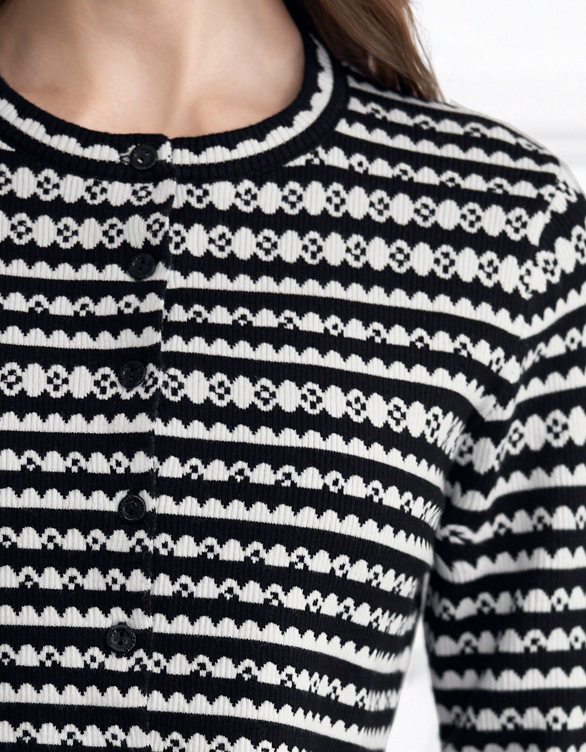 - Eye-catching ripple trim and bold striped pattern give this cardigan a playful, standout look