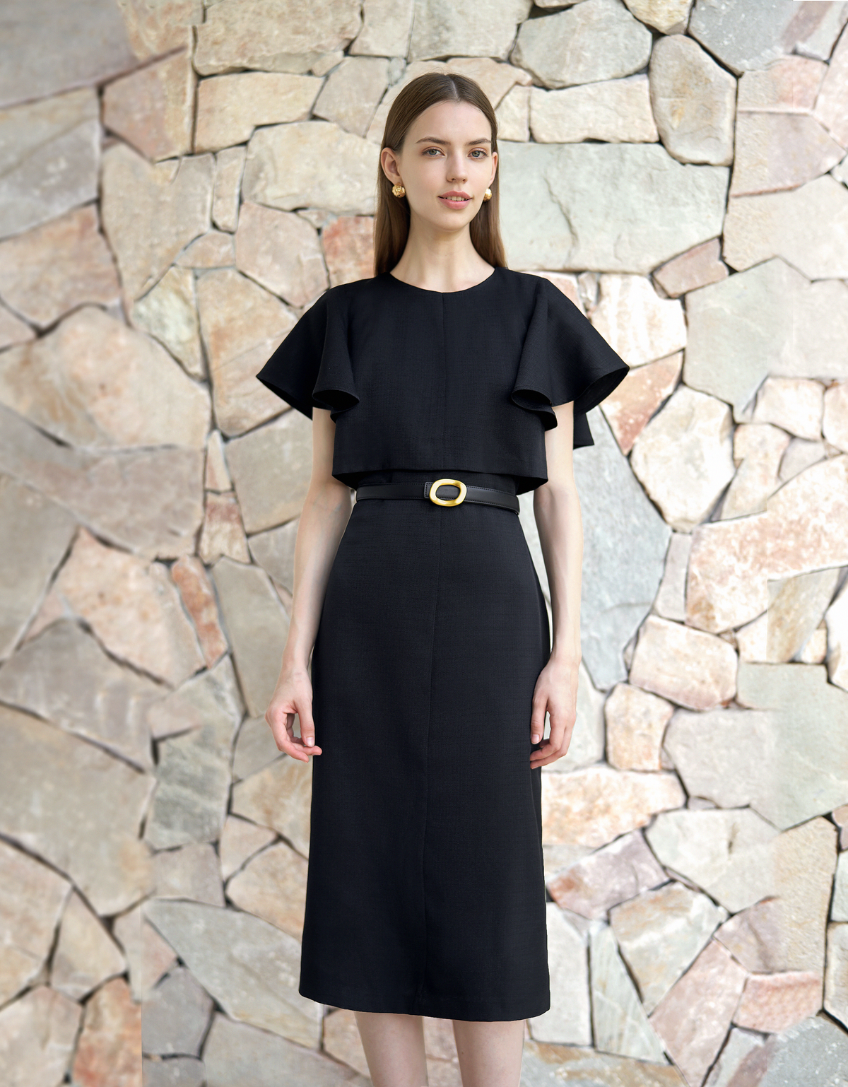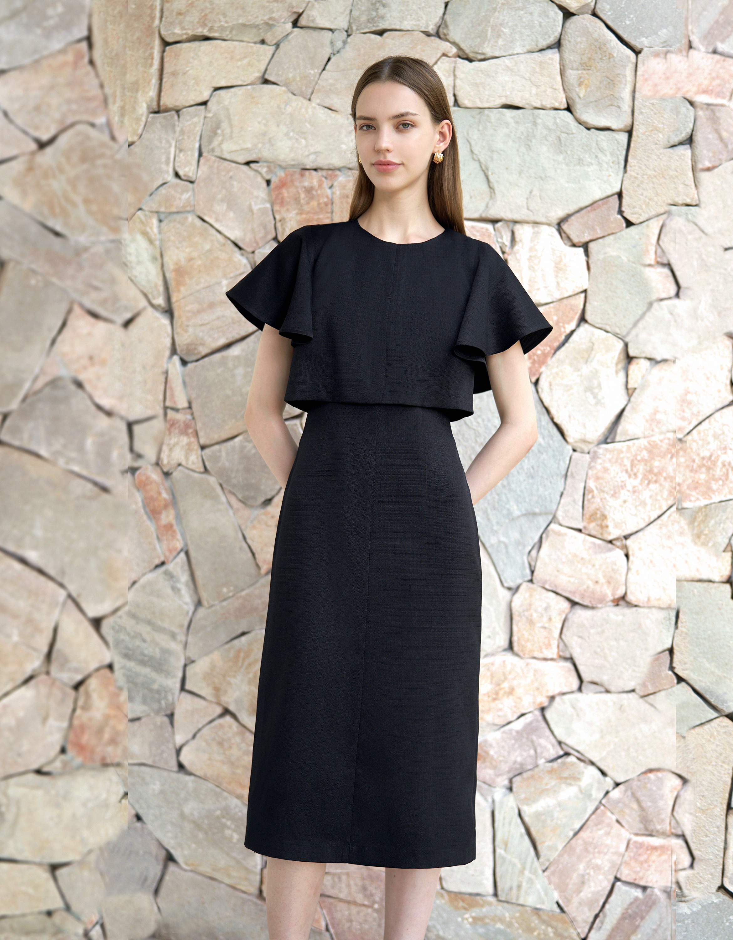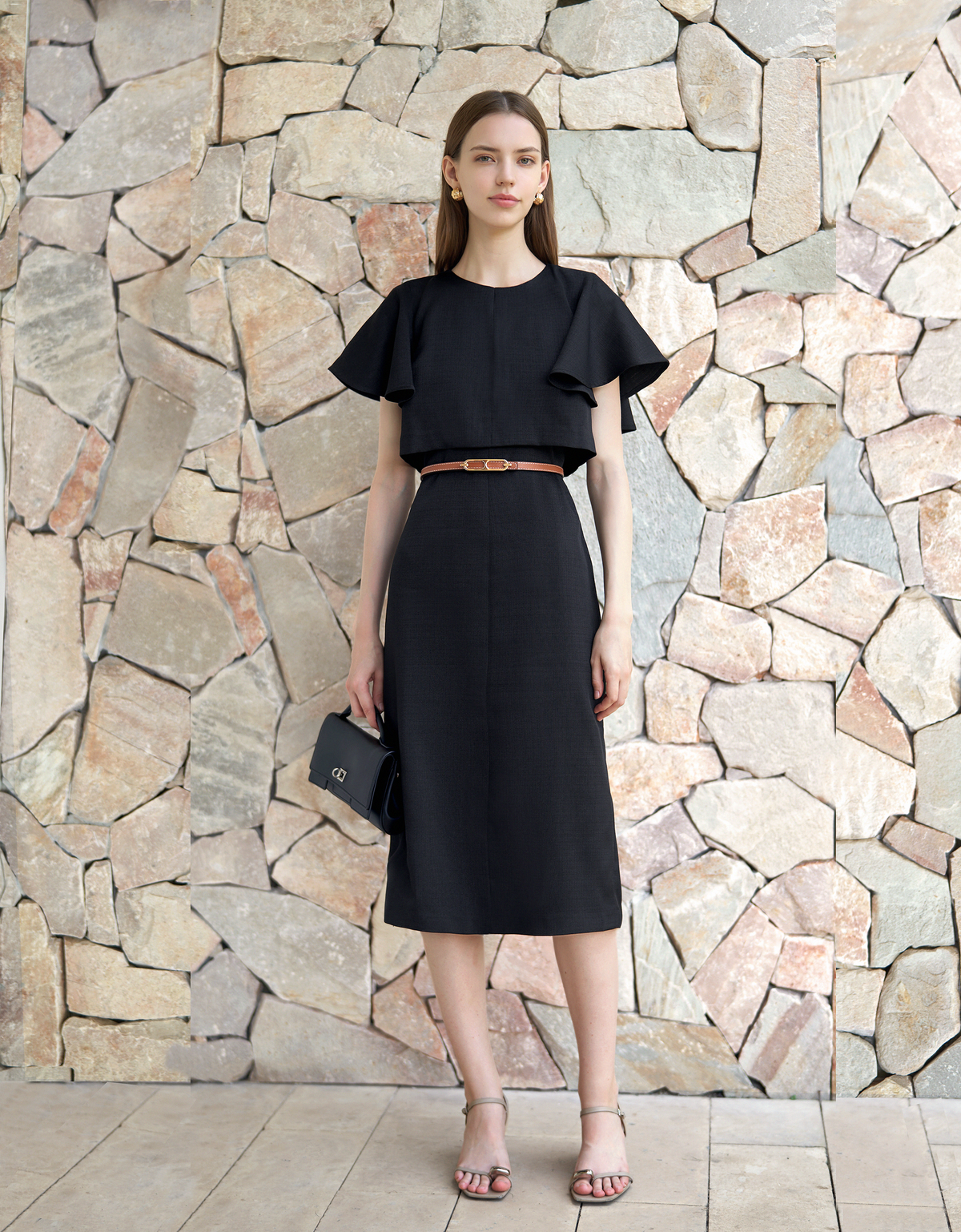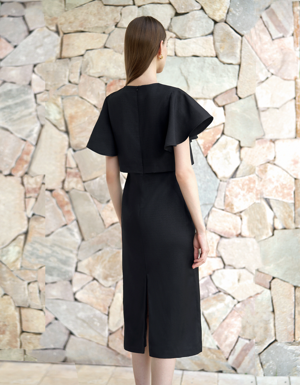 - Featuring a sleek midi silhouette designed to elongate the frame, with a layered bodice that creates the illusion of a refined two-piece set- A discreet center-back slit adds comfort and mobility