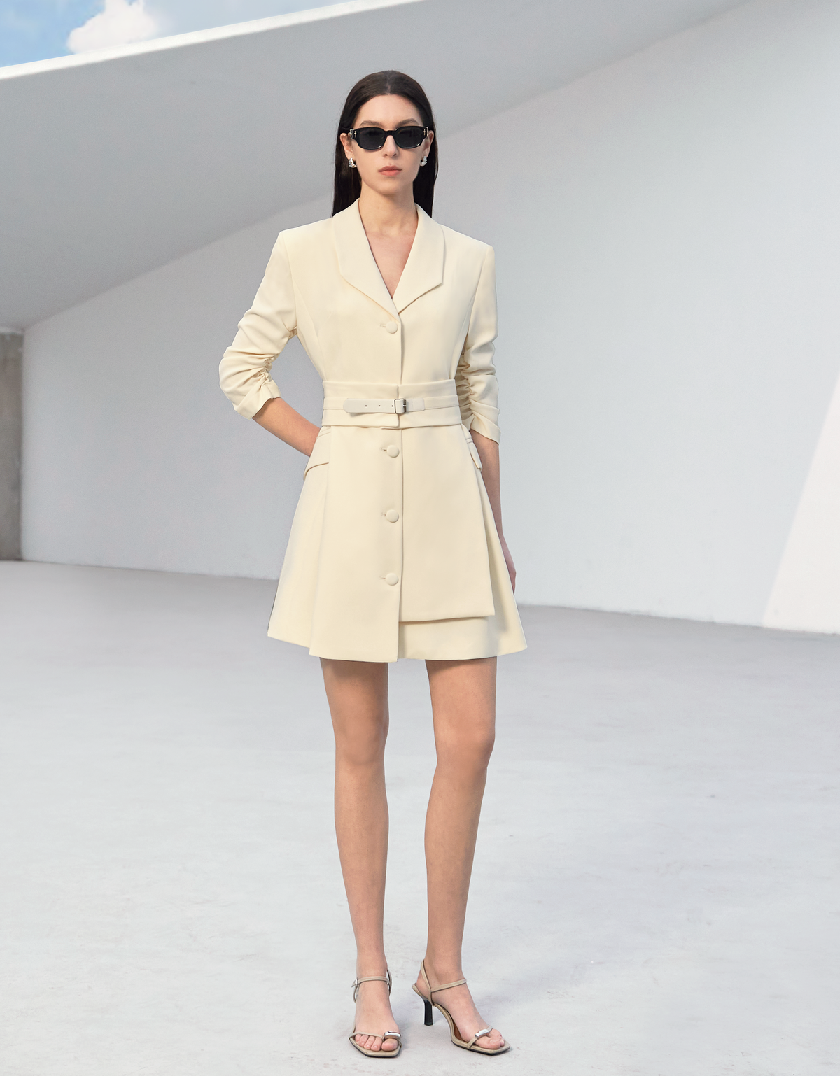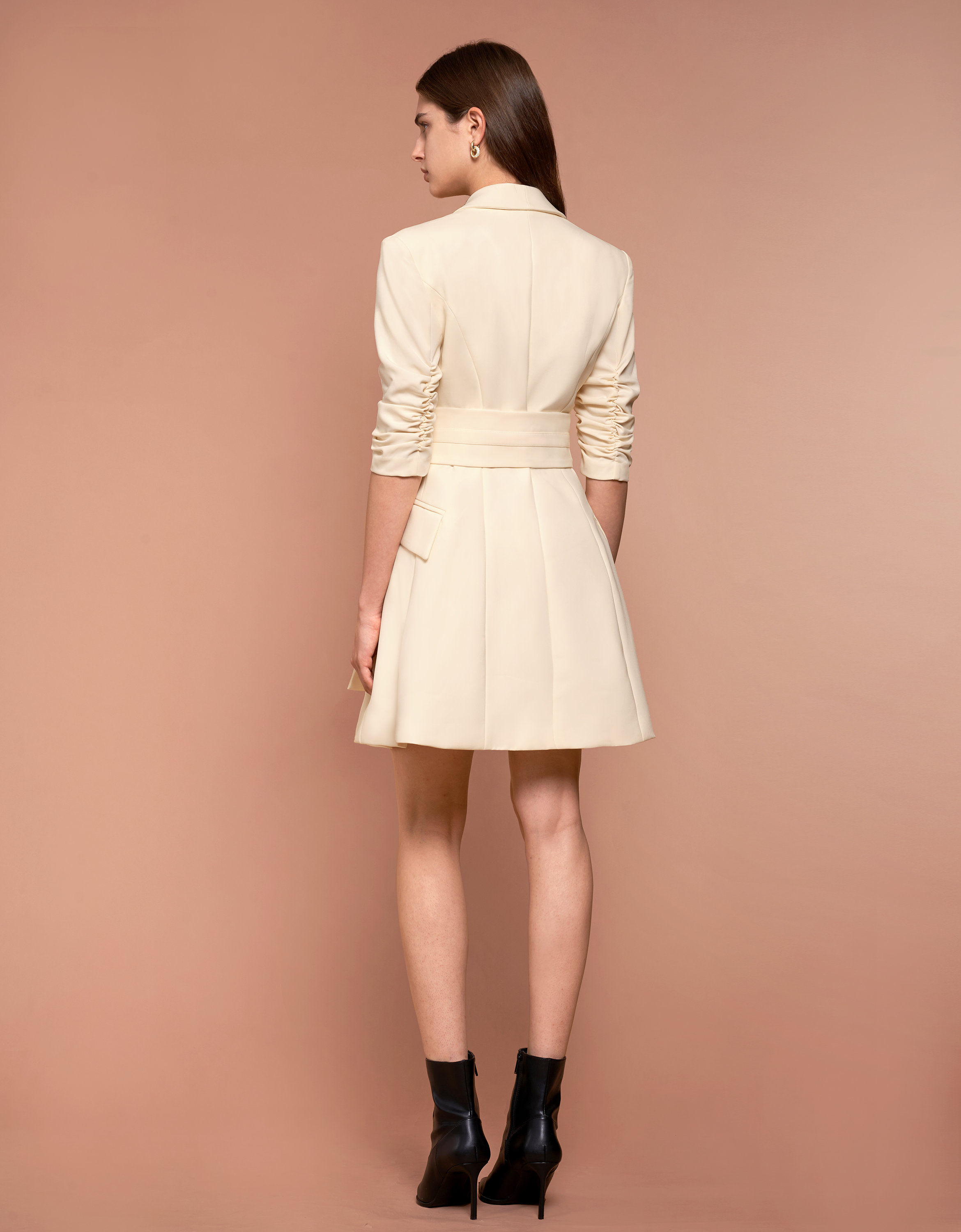 This dress offers a polished look with a modern twist. Its mid-length ruched sleeves provide the ease of movement missing from traditional blazers, while the tone-on-tone adjustable belt comfortably highlights the waist. Its easy-to-wear A-line silhouette flatters all body types, making it a versatile and stylish choice for any occasion.- Regular fit